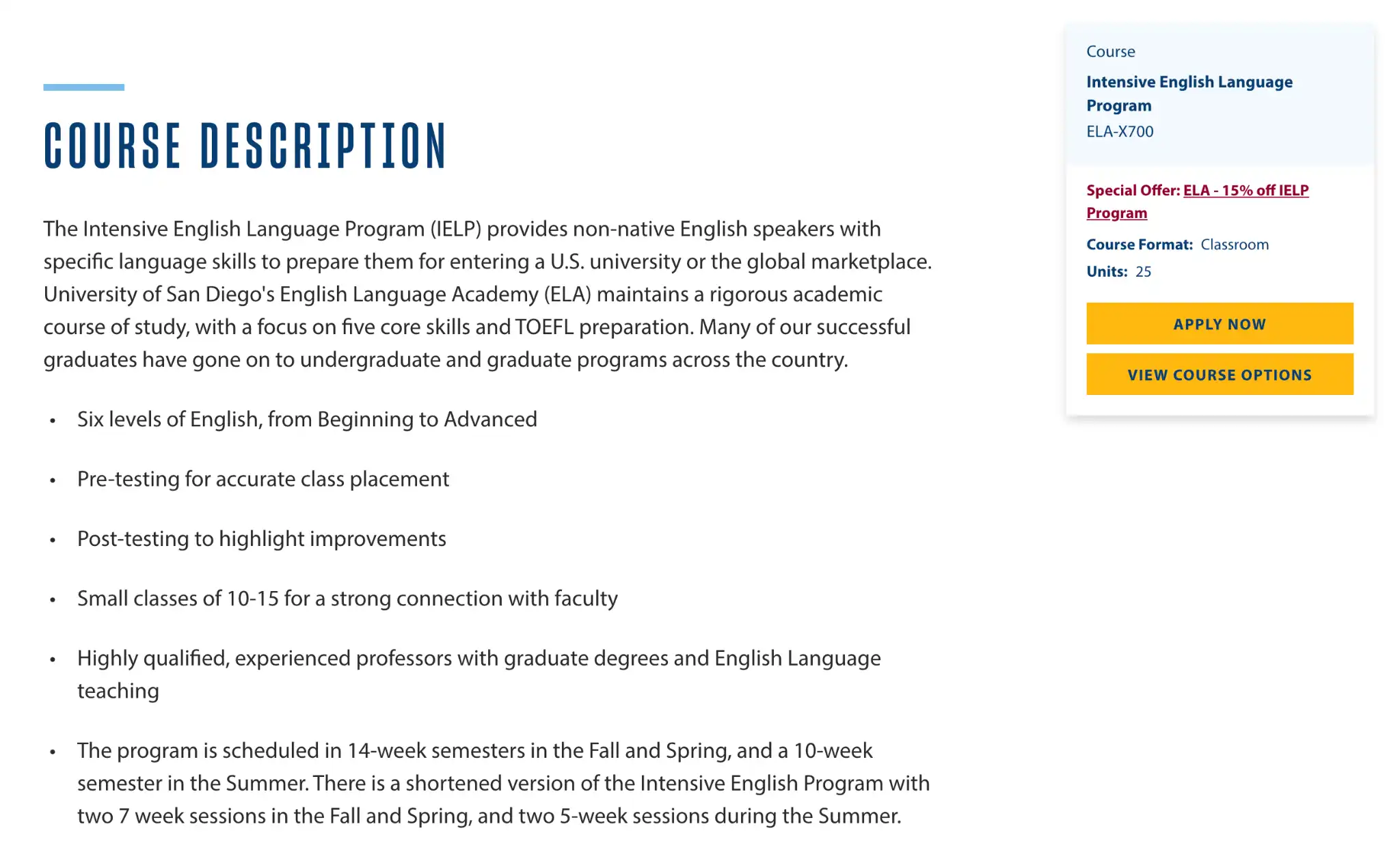 The English Language Academy (ELA), located on the campus of the University of San Diego (USD), offers a challenging curriculum in a beautiful Southern California setting. The ELA offers the following programs and courses: